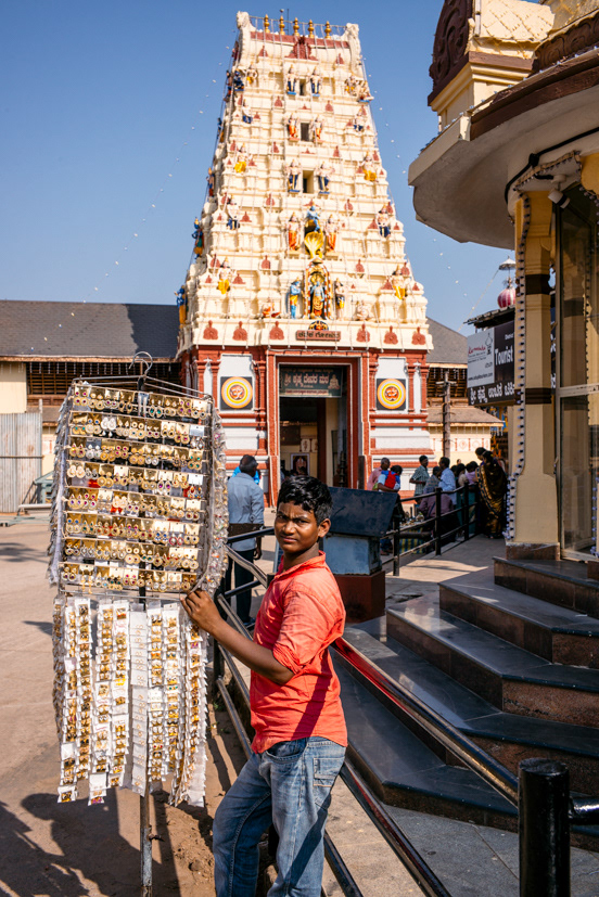 A boy selling jewellery at A Sri Krishna Matta temple.