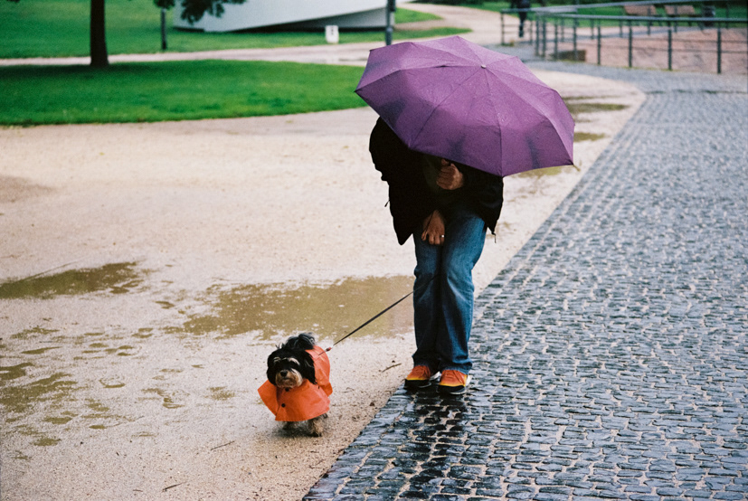 Dog walking in the rain.
